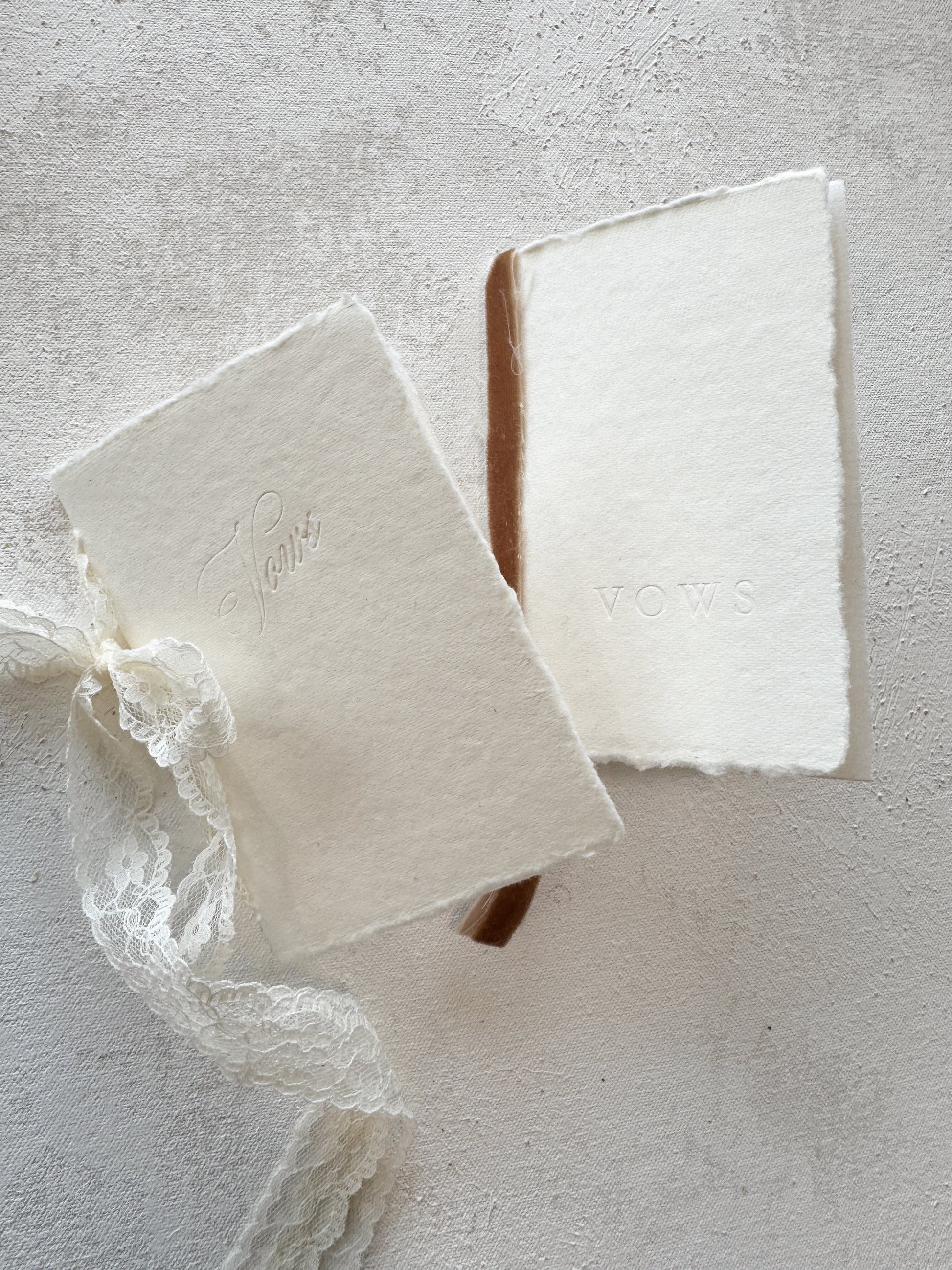 Featuring a set of 2 vow books. Finished on handmade deckle edge paper with blind debossing in two differen font styles. Laces ribbon on one and unfinished edge of spice colored velvet for the other.